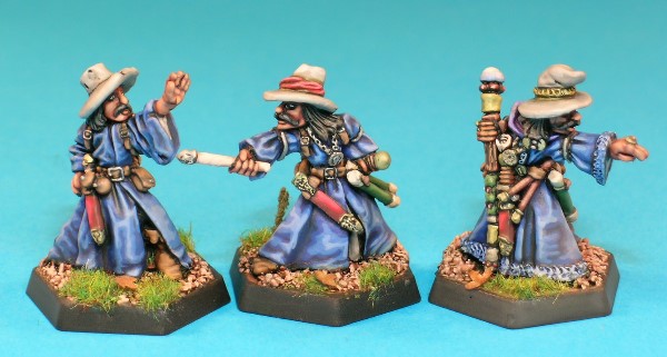 This set of 3 figures represents a male human Magic User player character at 3 different stages of career progression.