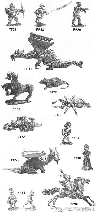 FF69 - Giant Wolf, FF28 Red Orc on Giant Wolf, FF1 Fiend, FF21 Goblin with Axe, FF60 Mummy, FF57 Giant Snake, FF45 Caveman with Club, FF41 Beserker with Sword and Axe, FF46 Caveman with Stone Axe and Spear, FF12 Mountain Giant with Battle Axe, FF11 Treeman, FF16 Two Headed Troll with Spiked Club, FF66 - Skeleton Rider on Horse of Hell, FF17 Minotaur, FF53 Ogre, FF9 White Wizard, FF2 Lord of Darkness, FF10 Eagle, FF58 Vampire, FF33 Great Fire Dragon, FF18 Wraith