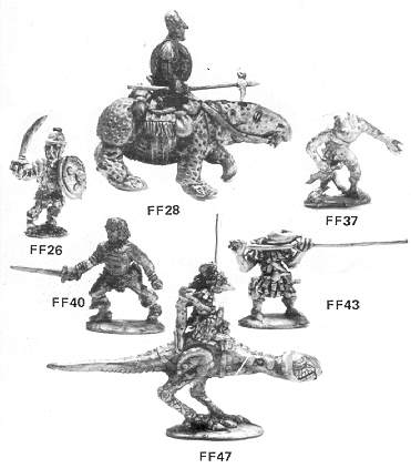 FF1 The Fiend, FF3 Crabman, FF4 Hook Horror, FF5 Phantom Stalker, FF7 Death Worm, FF9 Carbuncle, FF10 Devil Dog, FF11 Grell, FF13 Bonesnapper, FF14 Cyclops, FF15 Hill Giant, FF16 Giant Troll, FF17 Minotaur, FF18 Wraith, FF20 Goblin with Sword, FF21 Goblin with Axe, FF28 Red Orc in Chainmail on Giant Tusker, FF26 Red Orc in Plate, FF37 Warrior of the Stone, FF40 Berserker, FF43 Salaman Warrior with Pike, FF47 Elite Salaman Trooper on Giant Strider