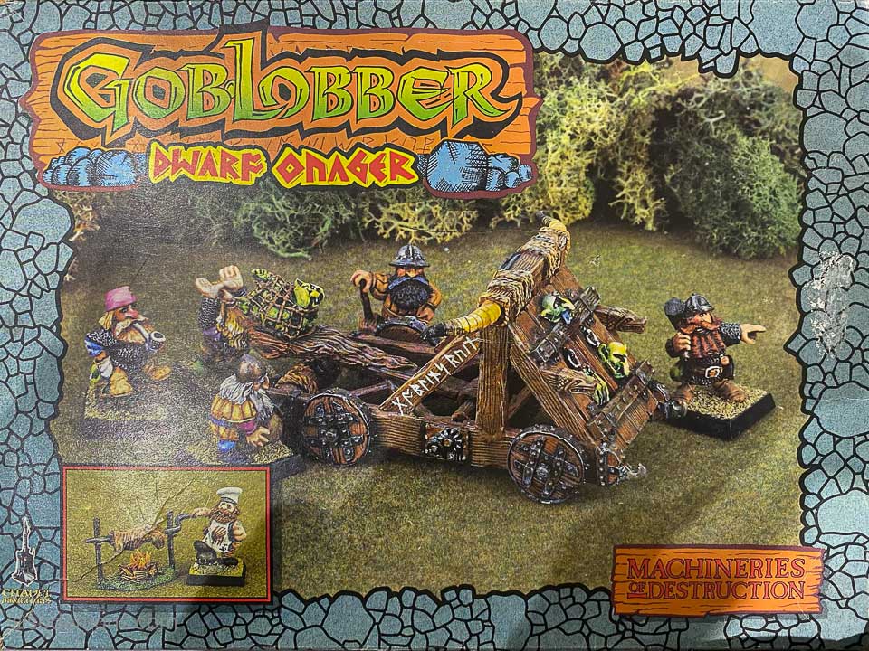 A horde of howling, ripping green-skinned fiends was: bearing down upon beleagured Dwarfhold. The catapult crew worked their machine frantically, raining rocks, down the advancing hordes, but the advance seemed irresistible. Then true disaster struck. For a hundred yards around the catapuIt, there was not a rock to be seen - all had been prised out of the ground and fired at the approaching, Goblins.