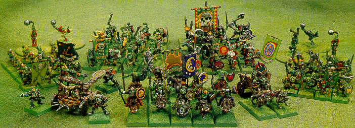 20 Orc Archers, 20 Orc Warriors, 10 Orc Boar Riders, 20 Goblin Archers, 20 Goblin Warriors, 6 Goblin Fanatics, Man Mangler and Chariot