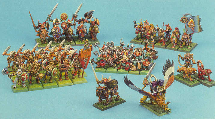 20 Beastmen, 10 Chaos Thugs, 20 Chaos Dwarves, 1 Chaos Champion on War Griffon, 6 Mounted Chaos Warriors and Beastmaster with 2 Chaos Hounds