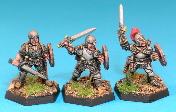 This set of 3 figures represents the career progression of a male human Fighter player character. As he increases in level, he gains more weapons and better armour.