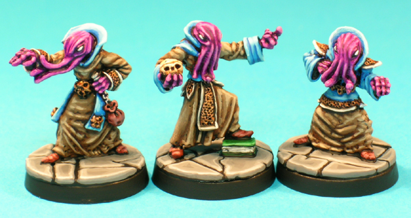 These psionic brain-suckers were the scourge of high-level subterranean adventurers. These figures were sold in sets of 3, and each pose had 3 different head variants with different tentacle positions.
