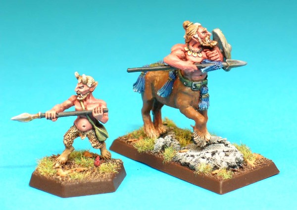 These figures represent a pair of woodland denizens, a half-man/half-horse centaur, and a half-man/half-goat satyr. They were supplied in blister packs containing one of each creature. The centaur is a three-part casting, with 7 different variant human bodies, 2 different horse body left sides (although there could well be a 3rd version out there) and 3 different horse body right sides. Technically, that means that at least 42 different Centaur models are available! The Satyr figure appears to have 9 different variants (I'm still looking for two of them), although there may be more. Variant differences can be seen in head position and facial features and equipment carried on the shoulder belt.