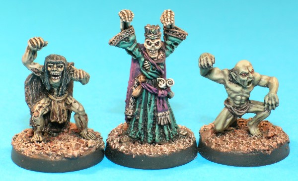 These figures represent some of the mid- to high-level Undead monsters which haunt the deeper levels of dungeons and ruined castles. Each blister pack contained 3 figures, a Ghast, a Lich & a Wight. The Ghast figure was replaced in 1986. There seem to be 6 or 7 variants of each casting, and the only differences on the variant figures are found in head detail and facial features.